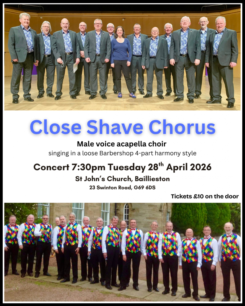 Tue 28th April 2026 7:30pm: Close Shave Chorus at St John’s Baillieston